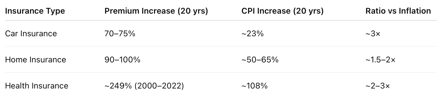 The cost of insurance generally outpaces the rate of inflation. This includes home insurance, car insurance, and if you live in a country without universal healthcare, like the United States, health insurance too. This is largely due to the increasing occurrences of climate disaster, auto theft, vandalism, and increasing cost of healthcare. Here’s a snapshot of how these three categories of insurance have outpaced inflation over the past 20 years: